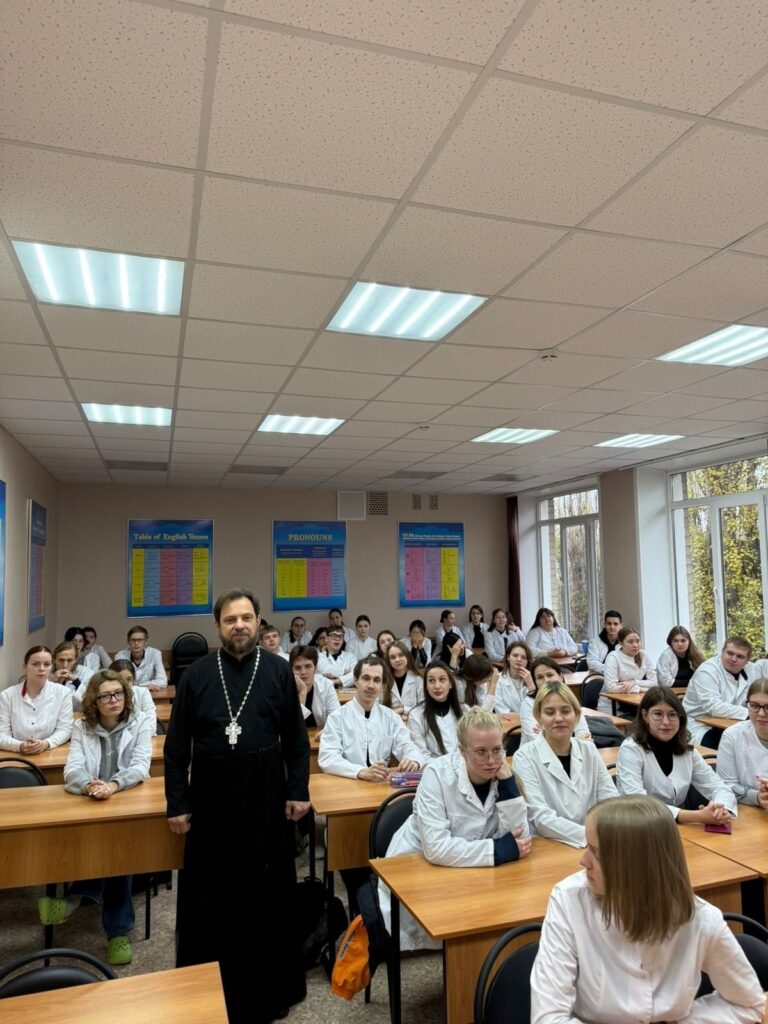 В понедельник, 10 ноября, настоятель нашего храма во имя Всех святых в земле Русской просиявших, благочинный Всесвятского церковного округа протоиерей Алексий Спицын встретился со студентами и преподавателями Воронежского базового медицинского колледжа. О. Алексий побеседовал с будущими медицинскими работниками о вопросах духовного осмысления профессии, рассказал о недавно прошедшем празднике — Дне народного единства и ответил на самые разные вопросы, волнующие студентов и преподавателей учебного заведения.